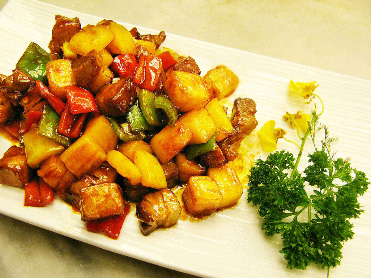这时候关火再倒入炸肉和菠萝是重点!高温酱汁会让菠萝出水,保持80℃左右温度快速翻炒十秒即可。最后撒上去籽的青红椒块,既能添色又不会过辣,小朋友也能放心吃。